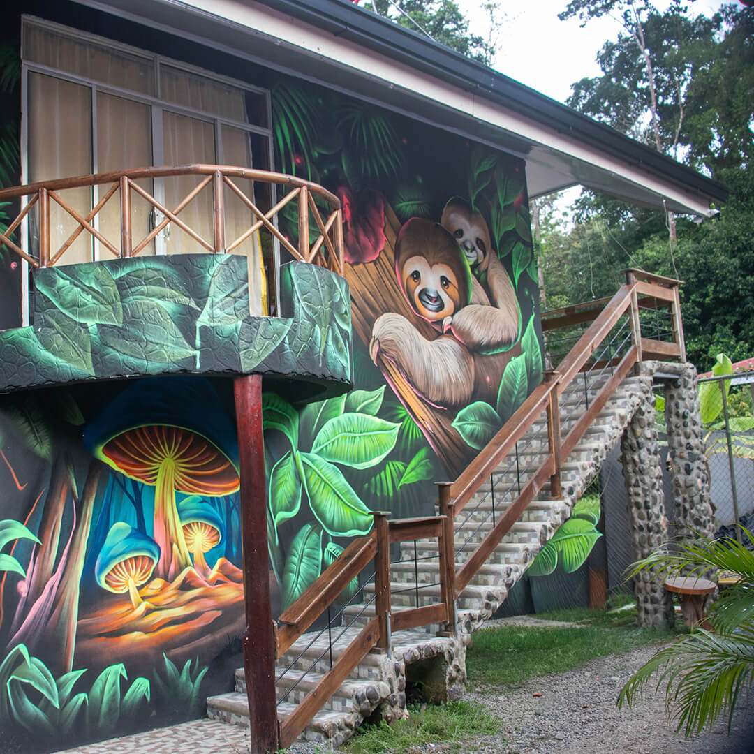 Uno de los detalles más especiales que nos distingue son nuestros murales inspirados en los animales de Costa Rica, pintados con amor por artistas locales. Al caer la noche, se iluminan con luces LED que los hacen brillar y transforman el ambiente en una experiencia mágica.